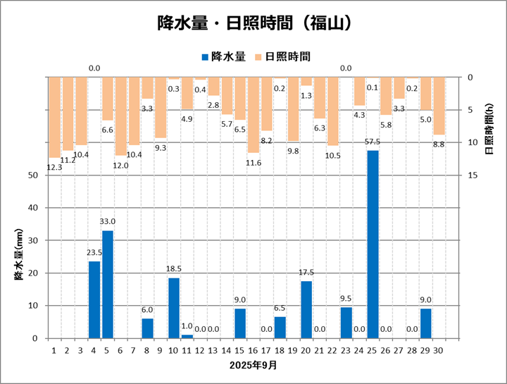 ■9月の天候 福山は、平均気温26.5℃ (平年差 +2.5℃)、降水量191.0mm (平年比140%)、日照時間171.5h (同104%)でした。 気温は平年よりかなり高く、降水量は多く、日照時間は平年並みの月でした。 9月の平年差+2.5℃は3位タイの記録でした。ここ3年の9月の高温が目立ちます。 ![]() ![]() ![]() |