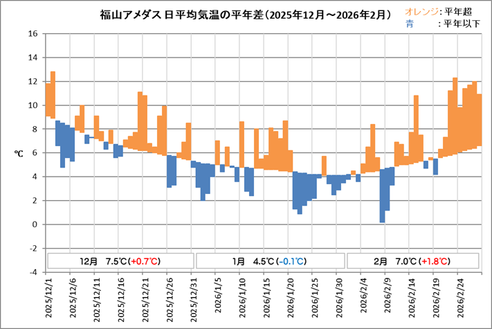 | ■2月の天候 福山は、平均気温7.0℃ (平年差 +1.8℃)、降水量65.5mm (平年比139%)、日照時間168.2h (同121%)でした。 気温は平年よりかなり高く、降水量は多く、日照時間も多い月でした。 24日から25日にかけての降水量は48.5mm。約4か月ぶりにまとまった雨が降ったと思ったら、2月としての24時間降水量の記録を更新しました。 ![]() ![]() |