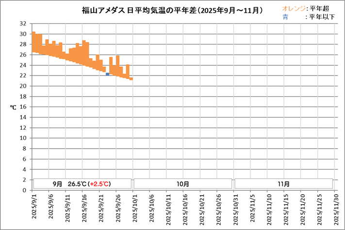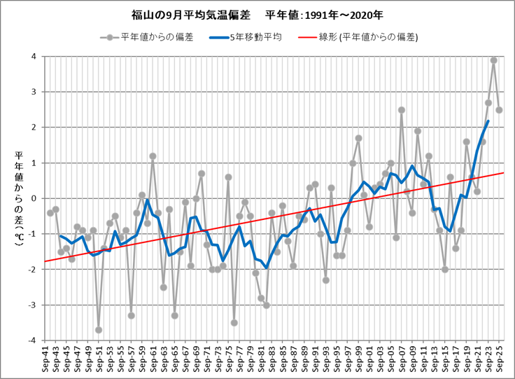 | ■9月の天候 福山は、平均気温26.5℃ (平年差 +2.5℃)、降水量191.0mm (平年比140%)、日照時間171.5h (同104%)でした。 気温は平年よりかなり高く、降水量は多く、日照時間は平年並みの月でした。 9月の平年差+2.5℃は3位タイの記録でした。ここ3年の9月の高温が目立ちます。 ![]() ![]() |