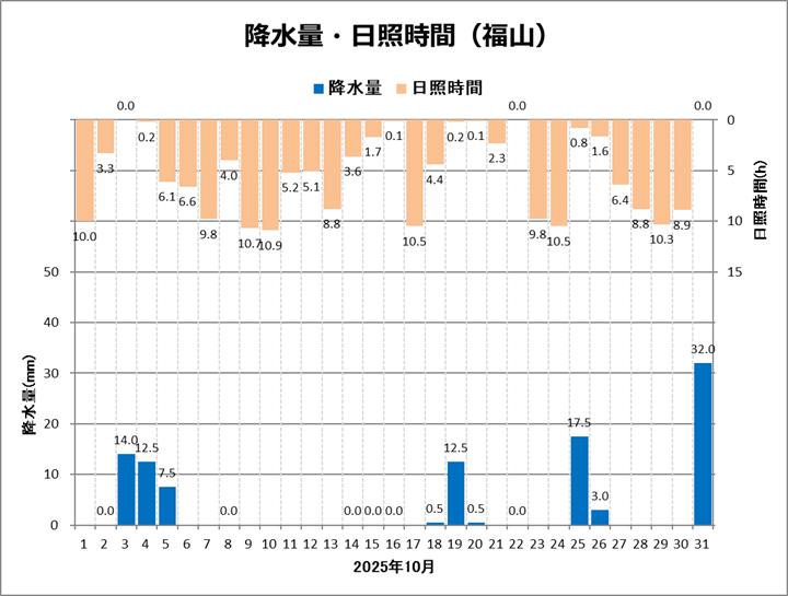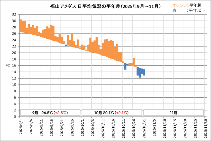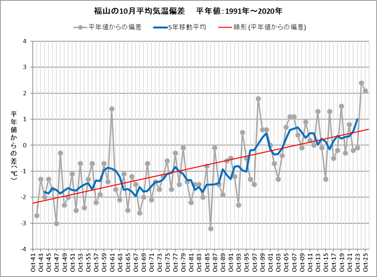 | ■10月の天候 福山は、平均気温20.1℃ (平年差 +2.1℃)、降水量100.0mm (平年比110%)、日照時間160.7h (同92%)でした。 気温は平年よりかなり高く、降水量は多く、日照時間は平年並みの月でした。 10月の気温の平年差+2.1℃は歴代2位の記録でした。 ![]() ![]() |